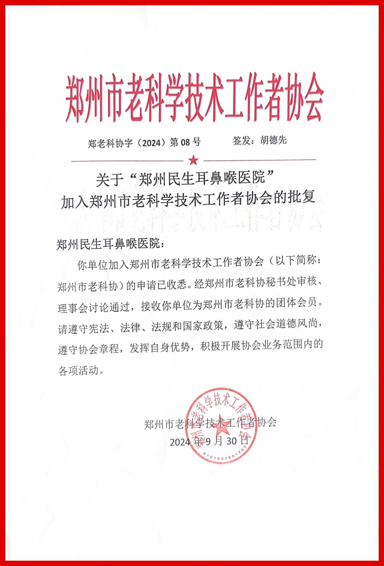 近日,经过郑州市老科学技术工作者协会的严格考察与审核,郑州民生耳鼻喉医院正式成为郑州市老科学技术工作者协会会员单位,这一重大喜讯为医院的发展注入了新的活力。