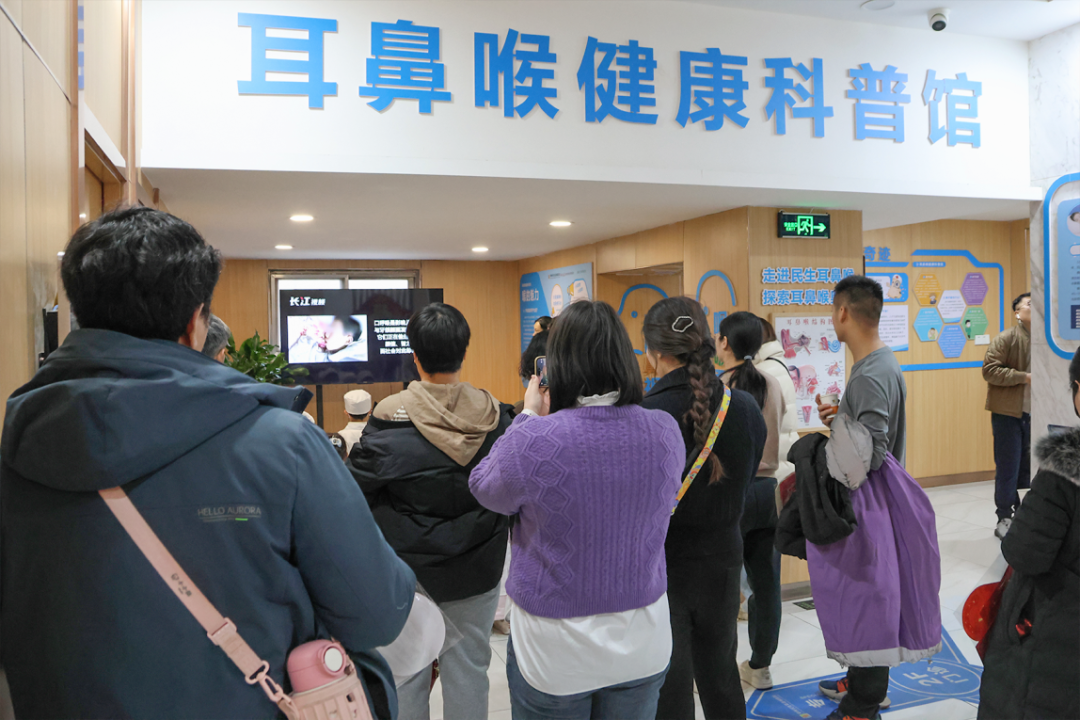 科普展区通过3D模型和视频动画展示,让孩子们“穿越”到耳、鼻、喉的内部世界。孩子们目不转睛地听着讲解:“原来耳朵能听见声音,是因为有三块小骨头在帮忙!”