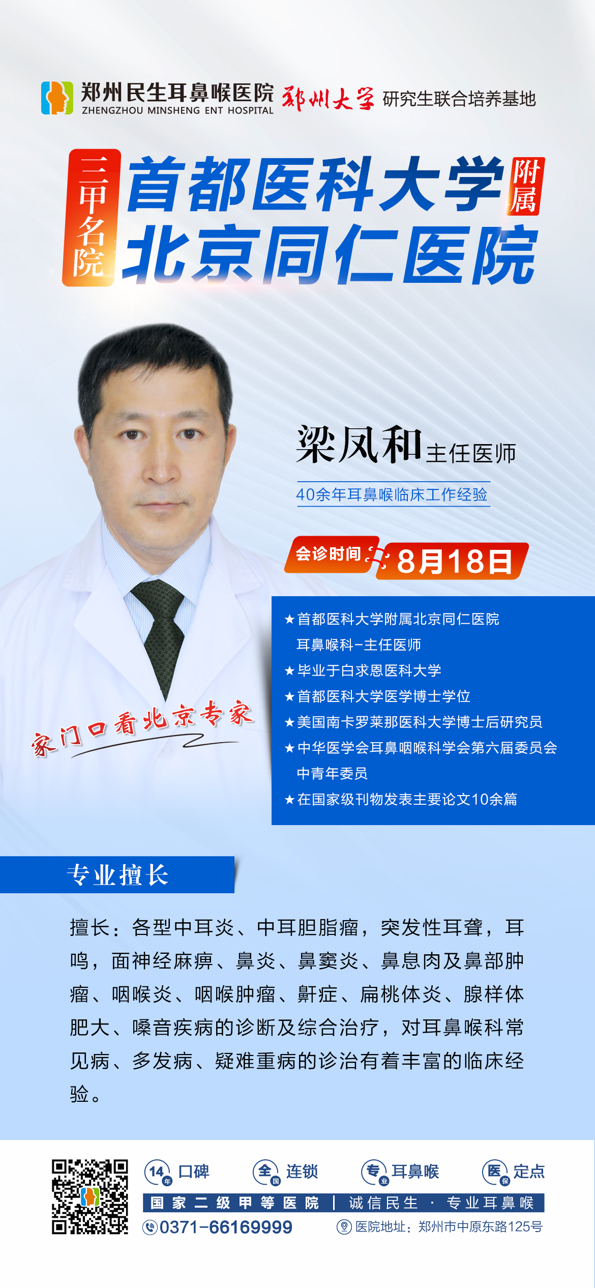 8月18日(本周日),首都医科大学附属北京同仁医院耳鼻喉科权威专家——梁凤和主任,受邀亲临郑州民生耳鼻喉医院,开展专家会诊活动。仅此1天,提前预约,先到先得,欢迎广大耳鼻喉患者前来就诊咨询。