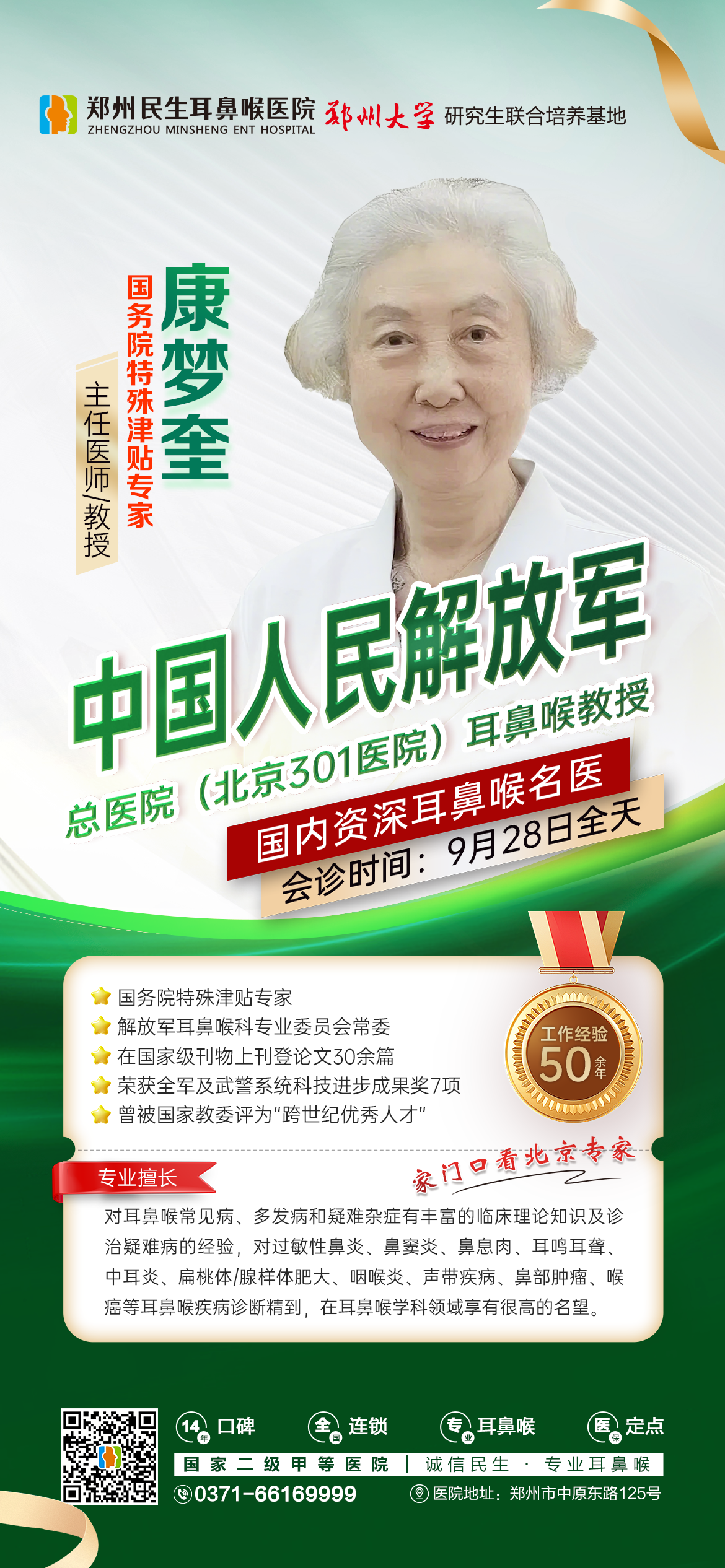 为积极响应国家关于促进优质医疗资源下沉的号召,让郑州及周边地区居民不出远门,在家门口看北京专家,好看病、看好病!郑州民生耳鼻喉医院于9月28日(周六)特邀北京301医院知名耳鼻喉专家康梦奎教授亲临我院,开展为期一天的专家会诊活动。
