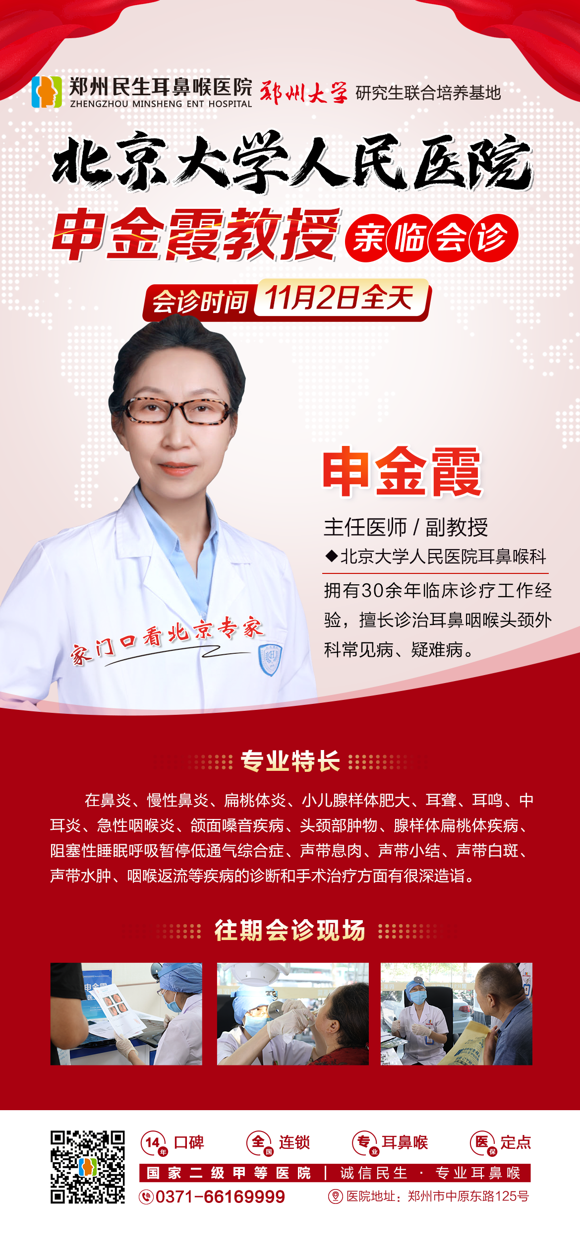 为了让郑州及周边地区的居民无需长途跋涉,即可在家门口享受到北京专家的顶级医疗服务,从而让患者好看病、看好病,郑州民生耳鼻喉医院特邀【北京大学人民医院】权威专家——申金霞教授,于11月2日(周六)亲临我院,开展为期一天的联合会诊及教学查房活动。