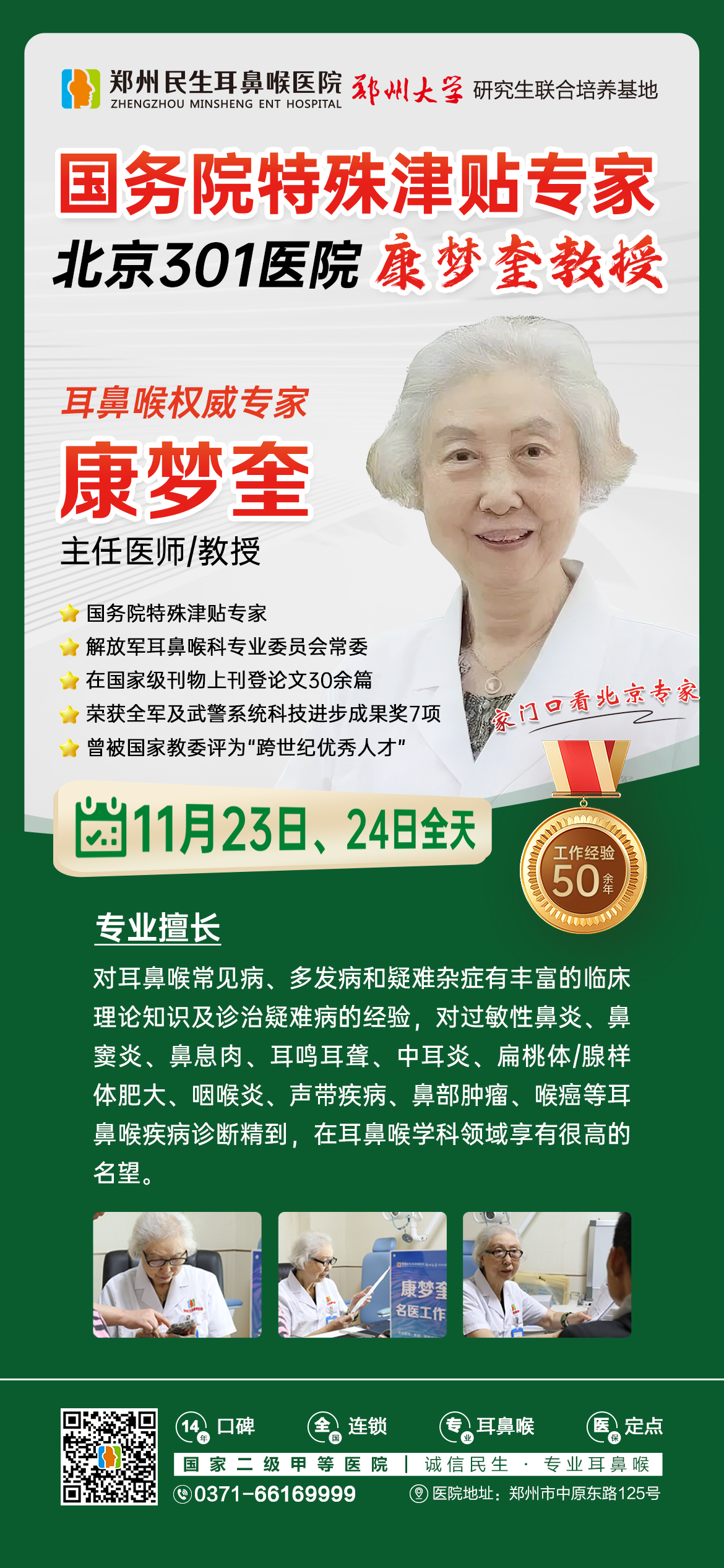 为积极响应国家关于促进优质医疗资源下沉的号召,让郑州及周边地区居民不出远门,在家门口看北京专家,好看病、看好病!郑州民生耳鼻喉医院于11月23日、24日(周六、周日)特邀北京301医院耳鼻喉权威专家康梦奎教授亲临我院,开展为期两天的专家会诊活动。