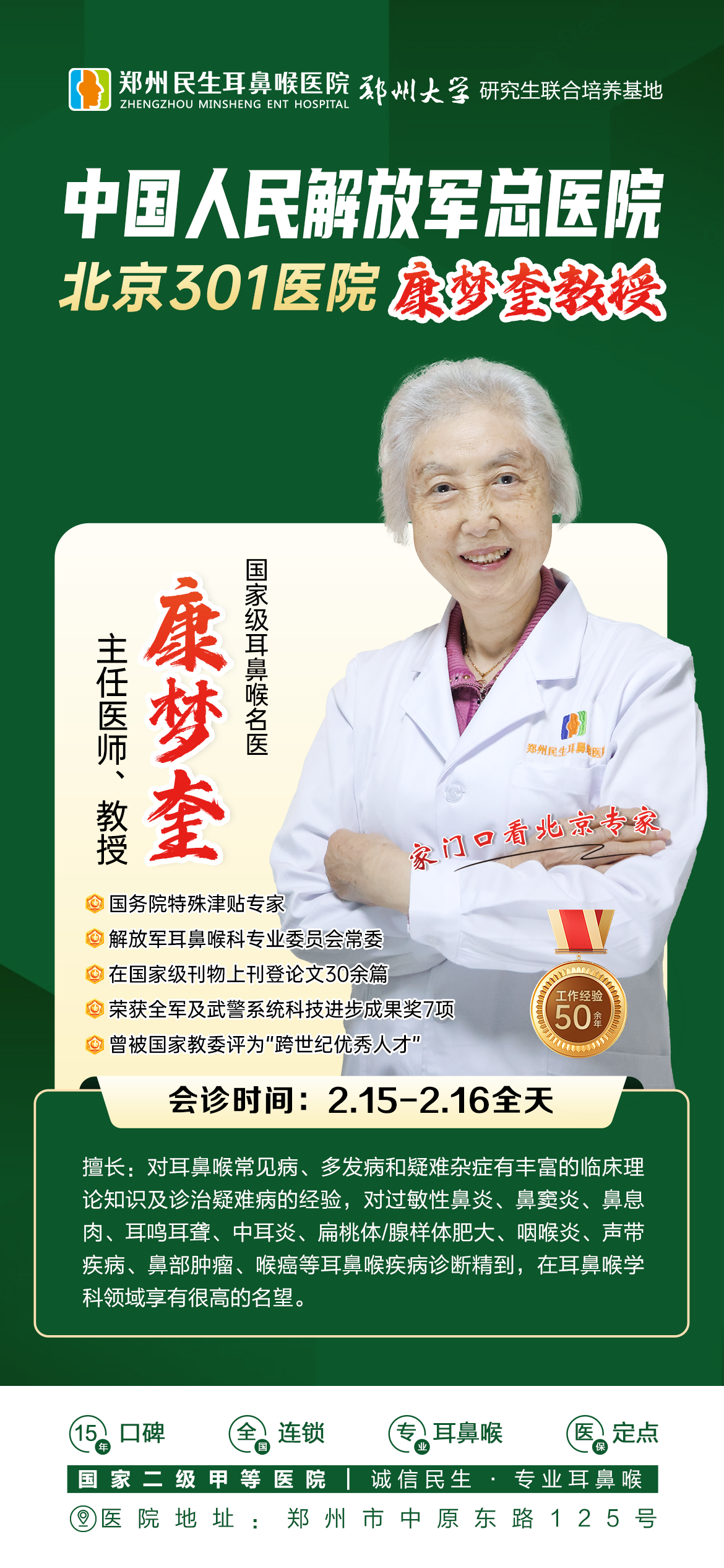 2月15-16日,北京301医院耳鼻喉专家康梦奎教授亲临郑州民生耳鼻喉医院,为郑州及周边患者提供高水平会诊!